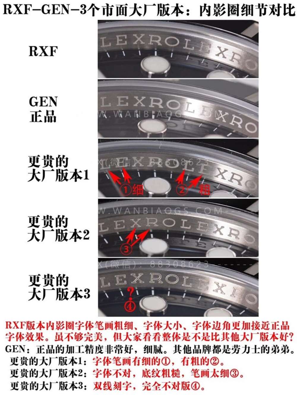 RXF-正品-3个市面大厂版本对比,这个3个市面大厂版本都是市面售价最高,升级了几代的最新版本。 RXF版本表盘的印刷效果、质感,比起其他3个市面大厂版本,是要更接近于正品的。