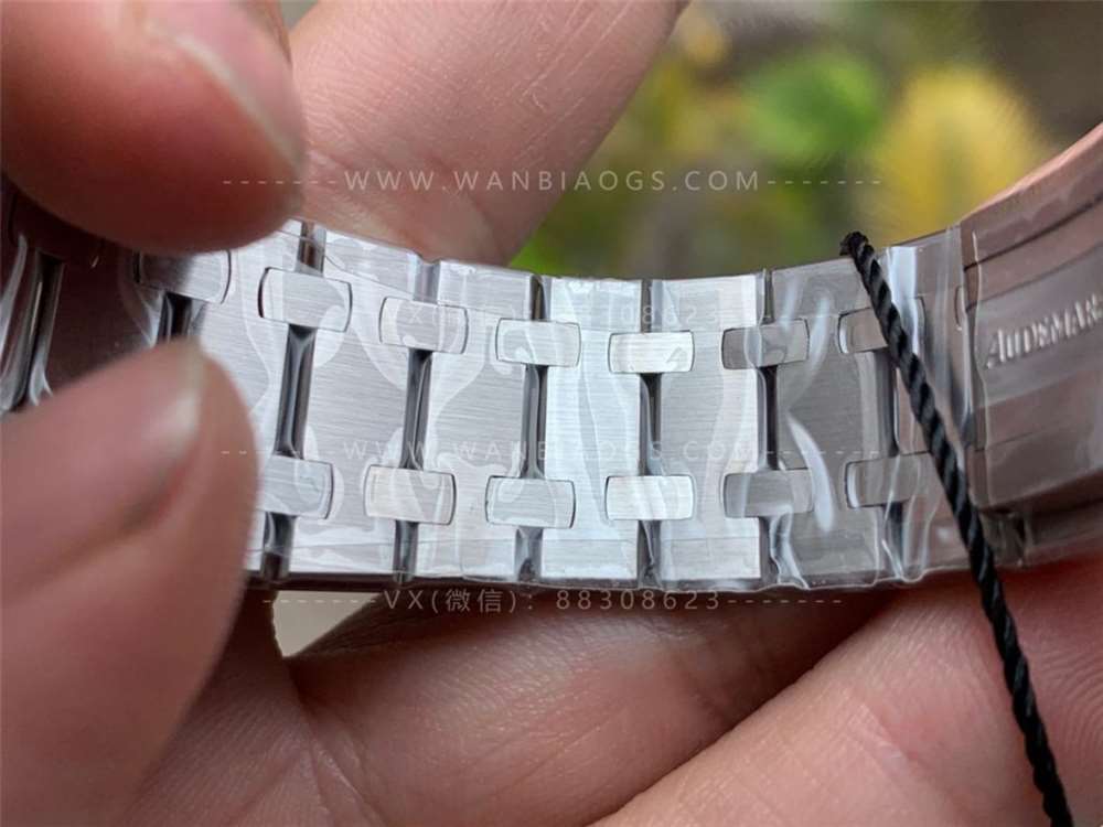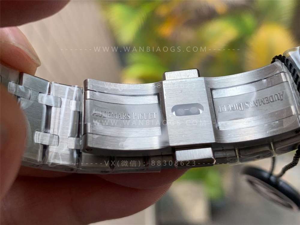 在看手机实拍表带,其实这一点JF也做的很好,两者不相上下,表带拉丝超级细腻,这种棱角分明的表带链节设计增加了此款腕表的金属机械感。表扣闭合之后AP的钢印这一扣我觉得是需要提升的,ZF厂做的缝隙略大了一些。表扣的款式功能以及设计细节同正品一致,做工精致。
