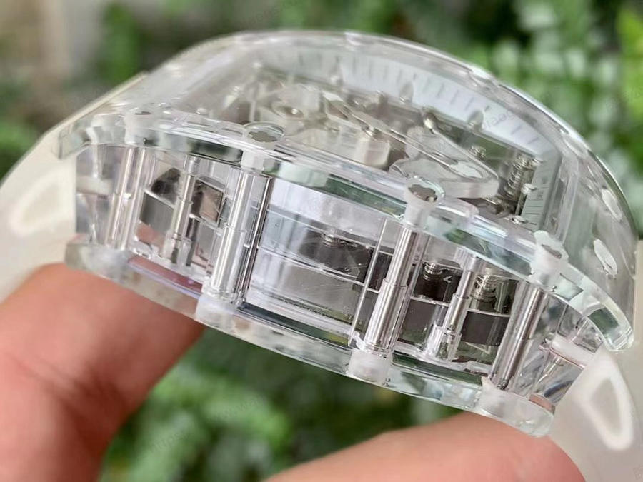 表带采用白色透明橡胶表带,利用纳米科技制成,有着无可比拟的透明性与耐力,表带的设计更将透明度推到极致。表扣采用折叠扣的设计,佩戴简单方便,上面还有理查德米勒英文logo。