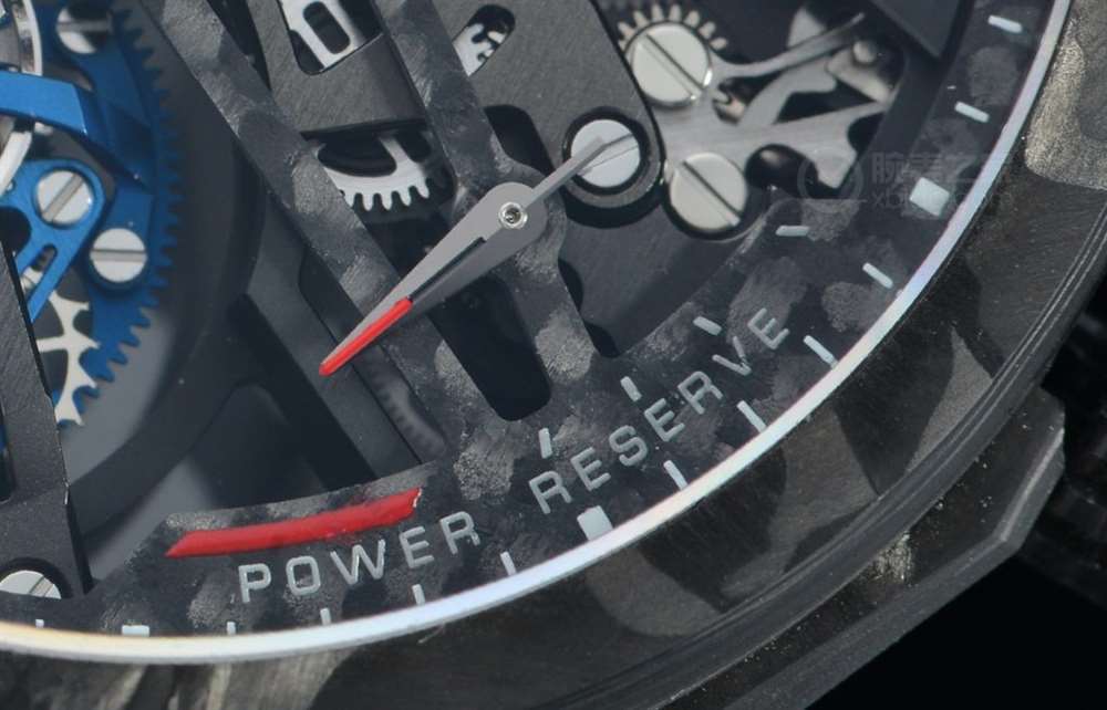 盘面下方6点钟位置处设立了全新的陀飞轮架构,同样以醒目的蓝色润饰,每60秒旋转一圈。右侧4点钟~5点钟位置处设立了动力储备显示功能,指针尾端以红色标明。