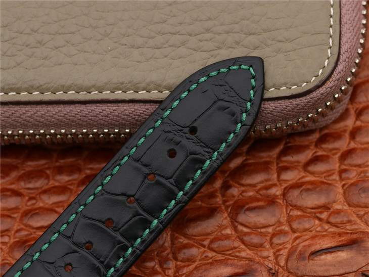黑色小牛皮表带,搭配红色的的缝线,很有味道,上面印压有仿鳄鱼皮纹理,并且不同的表盘颜色,小牛皮表带缝线的颜色与之相匹配。也可以搭配专用的鳄鱼皮表带。