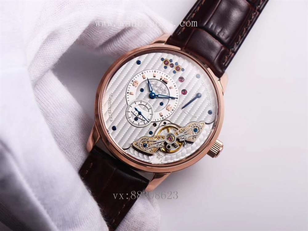 从外观上来看,这款腕表原汁原味的复刻了倒置机芯初代红金款的样子,数字时标和时圈的颜色均与正品保持一致。拉苏蒂柱状纹打磨镀铑四分之三夹板上的蓝钢螺丝和红宝石轴承、夜光涂层蓝钢指针、优雅大日历,任人欣赏;其在镌刻精美的摆轮夹板下方有规律地振荡,宛如跳动的心脏,蓬勃有力。其中电镀炭黑色四分之三夹板和蝴蝶摆轮桥板为配有金色螺丝摆轮的金银丝精工艺调校系统提供了尤为精彩夺目的展现舞台。