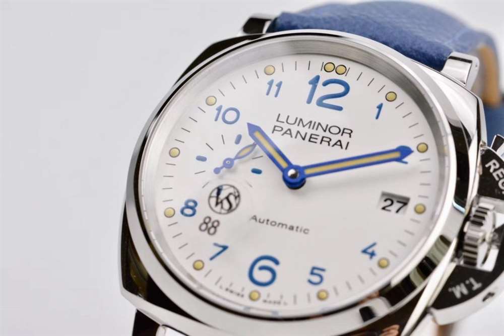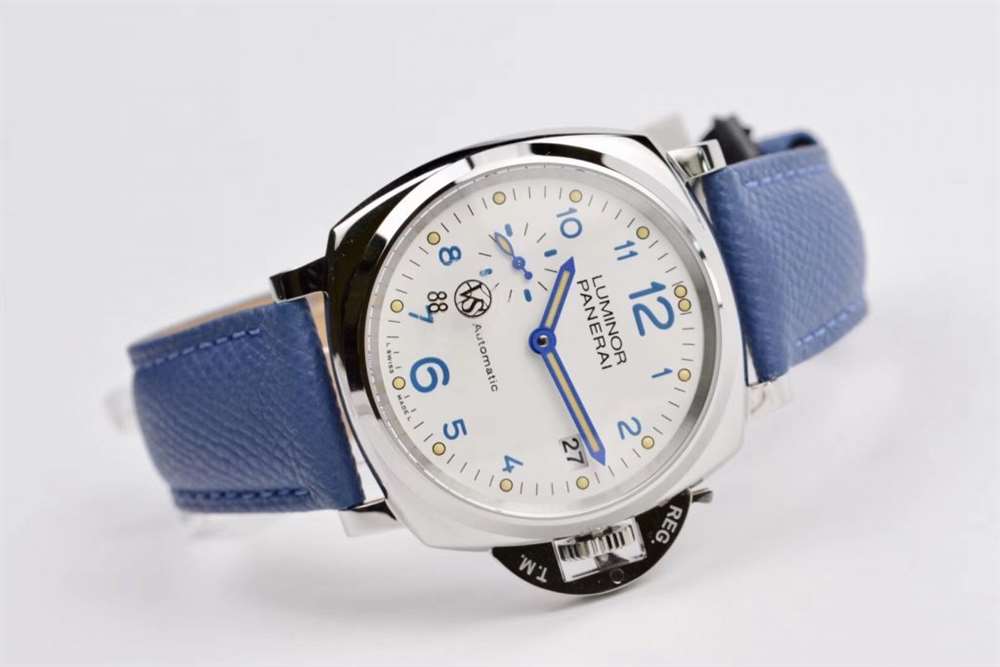 VS厂沛纳海PAM906腕表的面盘独特乳白象牙磨砂,彰显腕上柔情,蓝色大数字,清晰鲜明。海蓝色主调给人焕然一新,如果您既要沛NA海硬朗大气,又要儒雅大方,PAM906再合适不过。崭新超薄—儒雅绅士之选 。