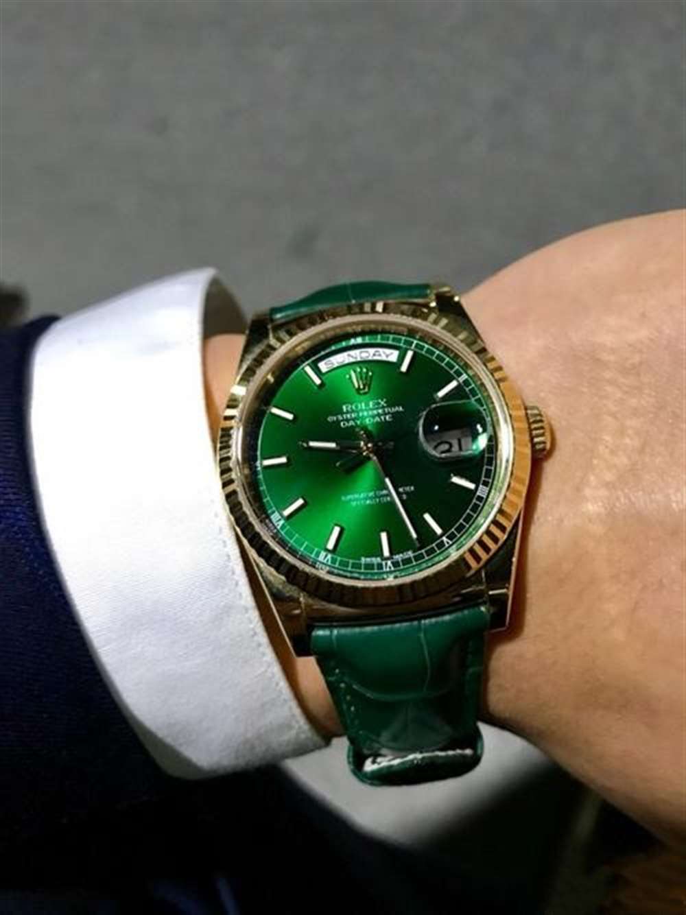 DD上手的感觉,DD的绿盘应该算是翠绿,不至于到绿鬼那般的墨绿,不过盘面的光泽倒是油性十足,不同的光照条件下,可以在黑色、绿色、灰色这几个色系之间游弋过度,很有几分把玩观赏性,具体的光照效果可以见下图。元首链比较衬手,半圆三角链对手腕贴合得很到位,光面+拉丝错层,结合表头的牙圈和盘面的立体罗马条字,在强光条件下,噌光瓦亮,非常晃眼,表头本身密度很高,上手直接就像镶在手腕上,很有几分分量。